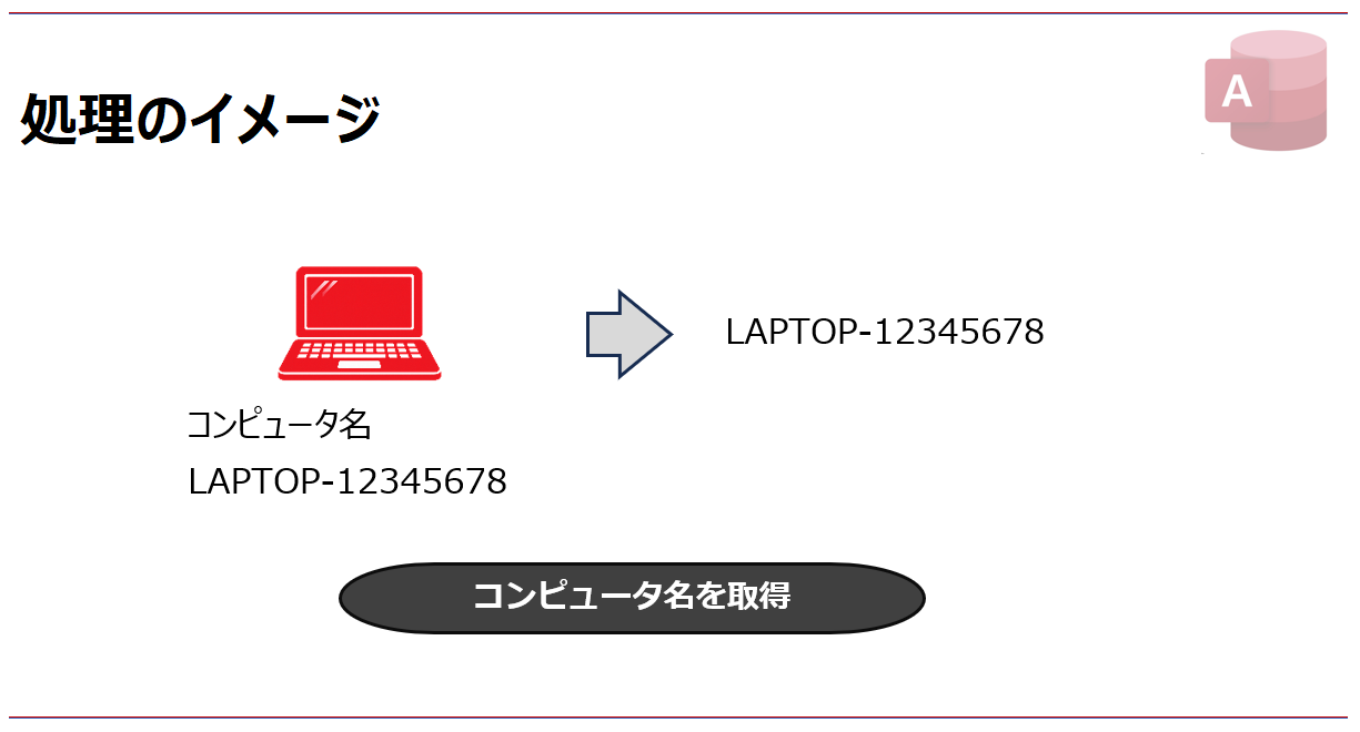 Accessで作成した集計や外部連携処理を、決められたPCのみで実行したいケースがあります。コンピュータ名をチェックすることで誤った端末からのバッチ実行を防止できます。